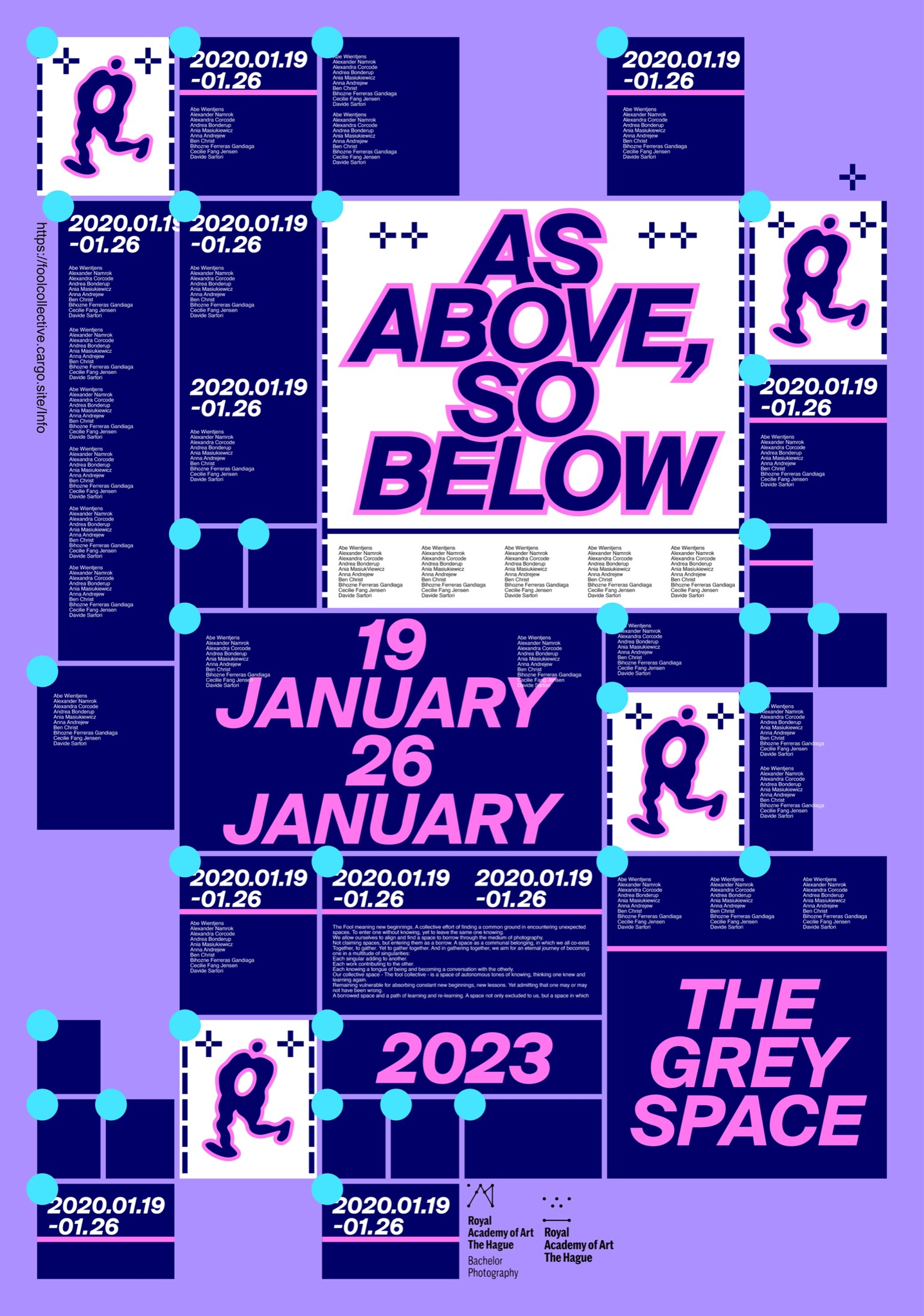 The promotion (marketing & design team) of the group exhibition of the Fool Collective (Roya Academy of Art, The Hague) in the Gray Space in the Middle.